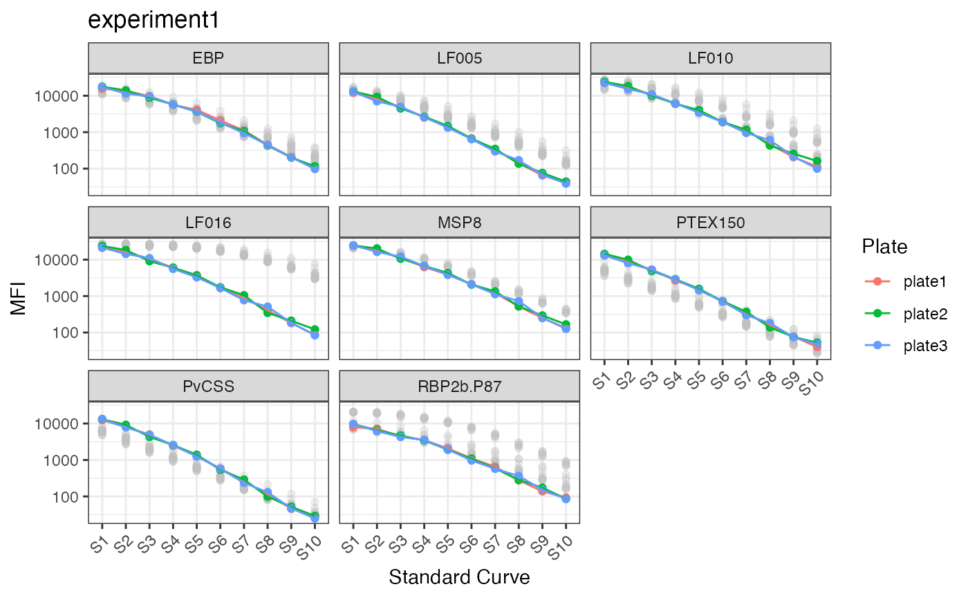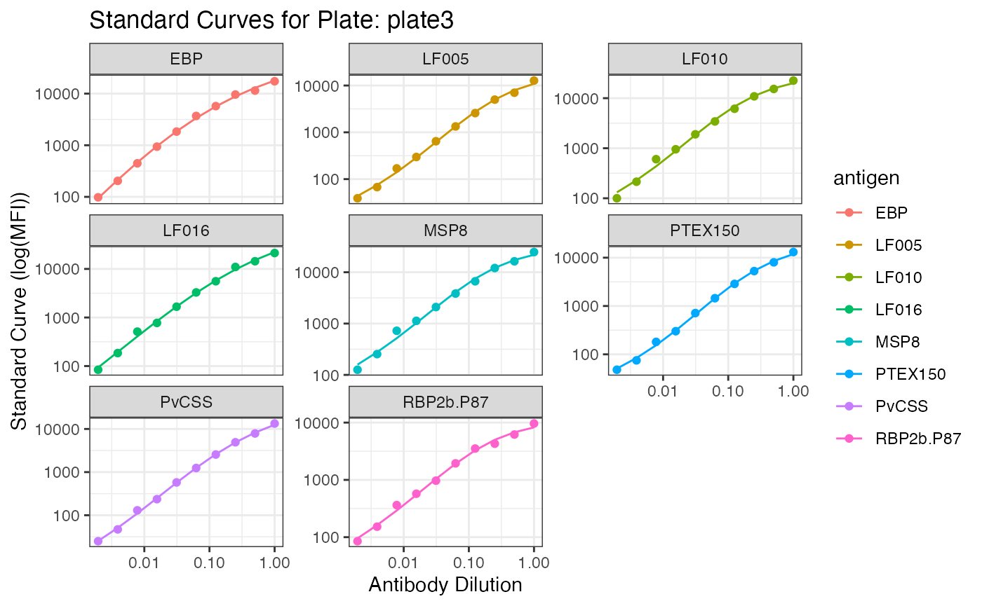 The standard curve plots are generated from the antibody data from the standards you indicated in your plate layout (e.g. S1-S10) and Median Fluorescent Intensity (MFI) units are displayed in log10-scale. In the case of the PvSeroTaT multi-antigen panel, the antigens will be displayed and in general your standard curves should look relatively linear (only when the y-axis is on logarithmic scale).