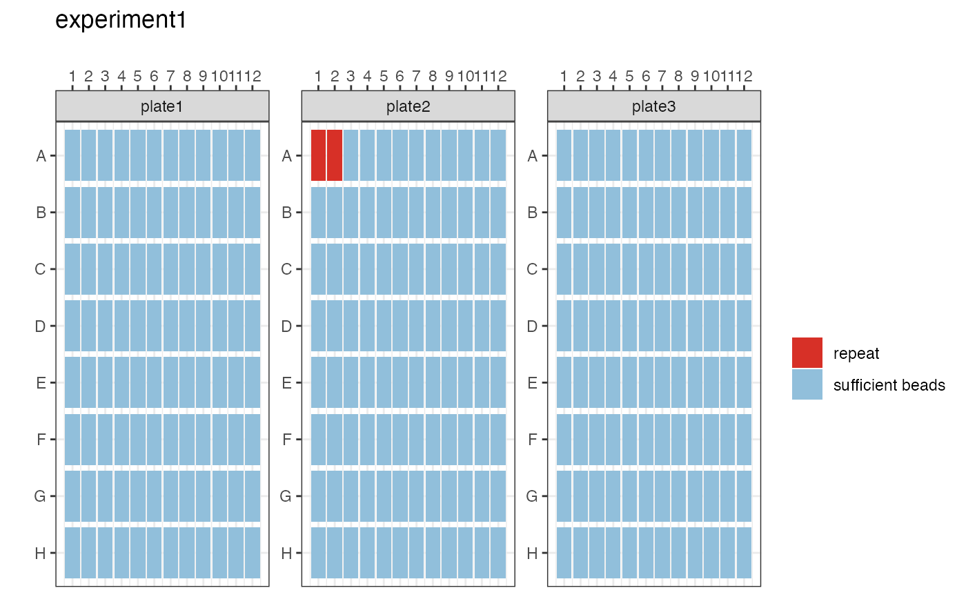 The function will inform you whether there are “No repeats necessary” or provide a list of samples to be re-run. In the example data, the beads in plate 2 wells A1 and A2 will need to be repeated