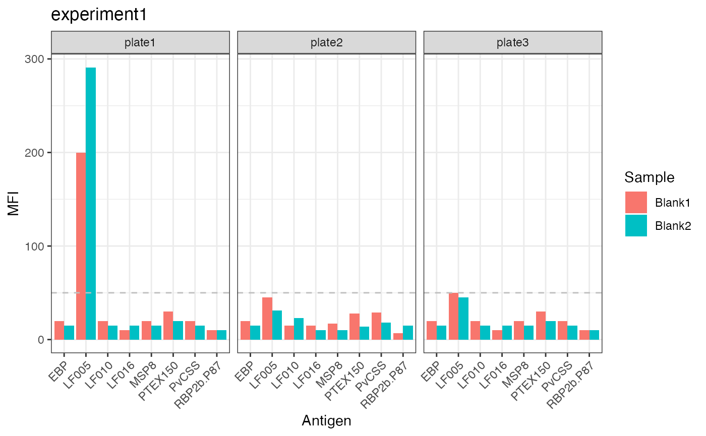 In the example data, blank samples recorded higher MFI values for LF005 on plate 1 and should be checked to confirm this is expected from the assay.