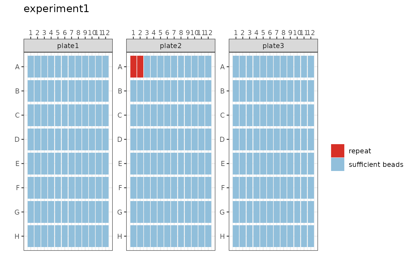The function will inform you whether there are “No repeats necessary” or provide a list of samples to be re-run. In the example data, the beads in plate 2 wells A1 and A2 will need to be repeated