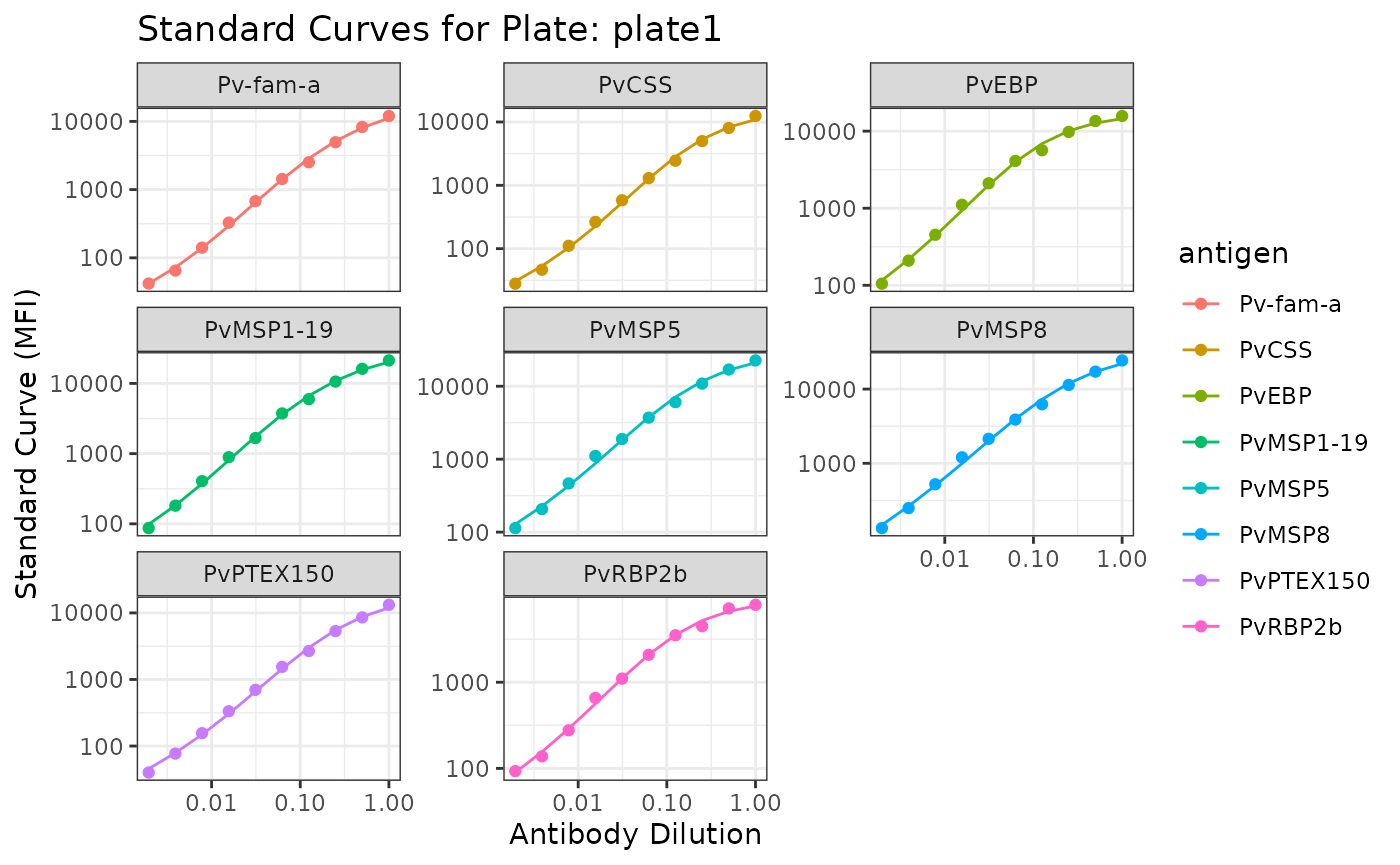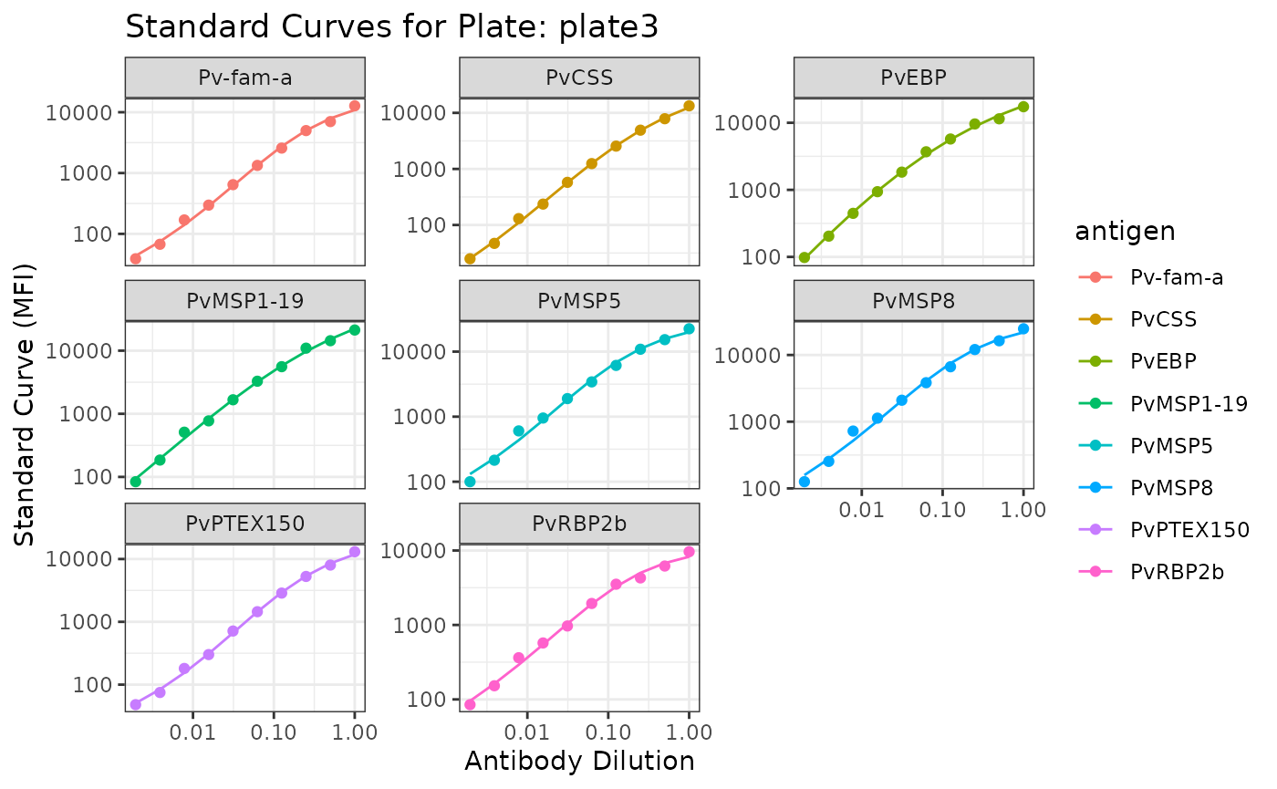 The standard curve plots are generated from the antibody data from the standards you indicated in your plate layout (e.g. S1-S10) and Median Fluorescent Intensity (MFI) units are displayed in log10-scale. In the case of the PvSeroTaT multi-antigen panel, the antigens will be displayed and in general your standard curves should look relatively linear (only when the y-axis is on logarithmic scale).