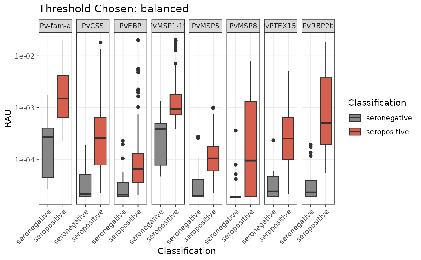 One example of data visualisation to detect the median and interquartile range of the RAU values per antigen for seropositive and seronegative individuals. Please note that the `classifyResults()` function must be run first.